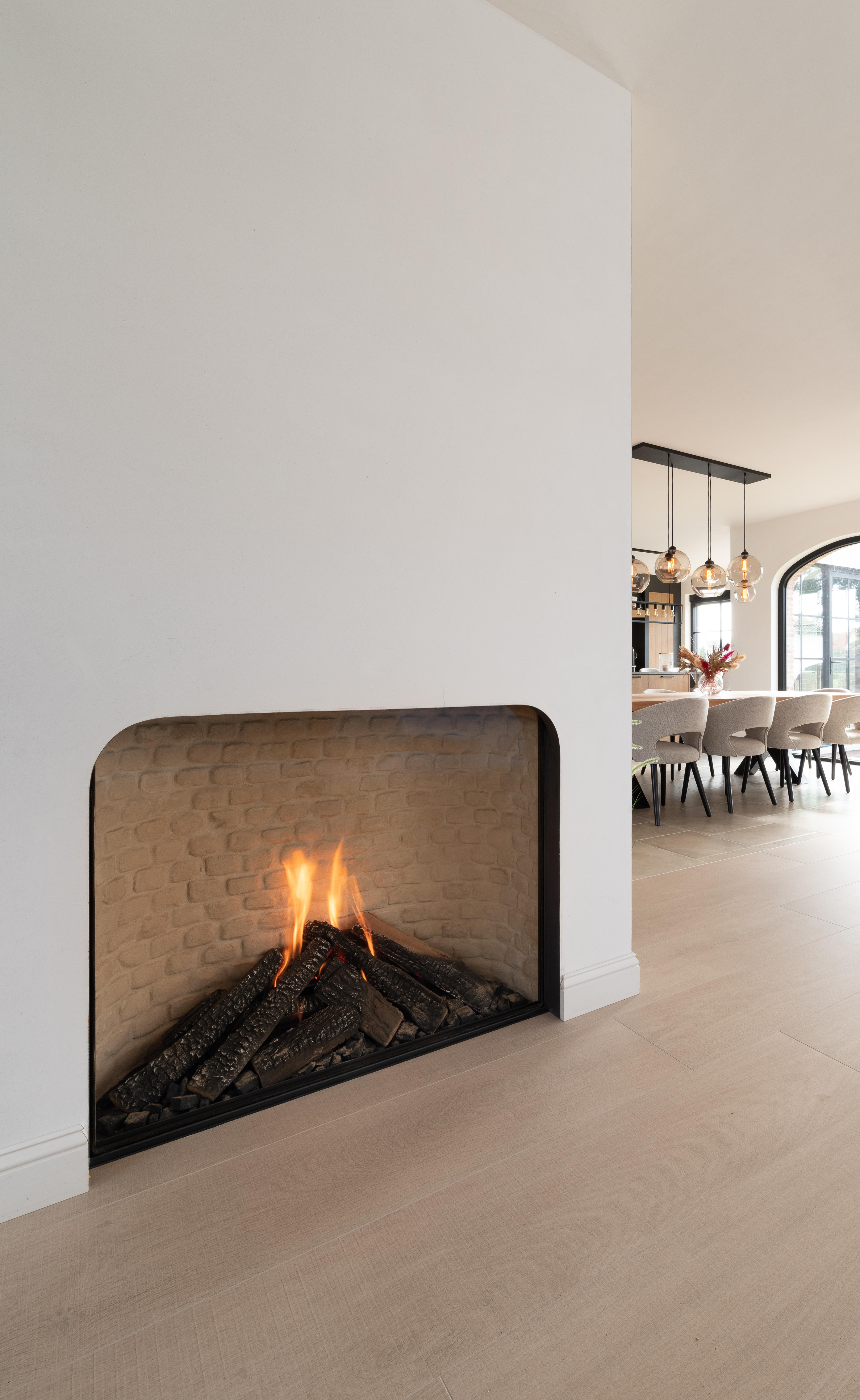 We zien hier een afgeronde gashaard van Cosyflame, met een gekaleid interieur. De haard werd ingebouwd op vloerniveau om het gevoel van een echte openhaard te evenaren. De TV kast met bijhorende legplanken weren voorzien in hout fineer, op de kast werden zwarte handgrepen geplaatst.