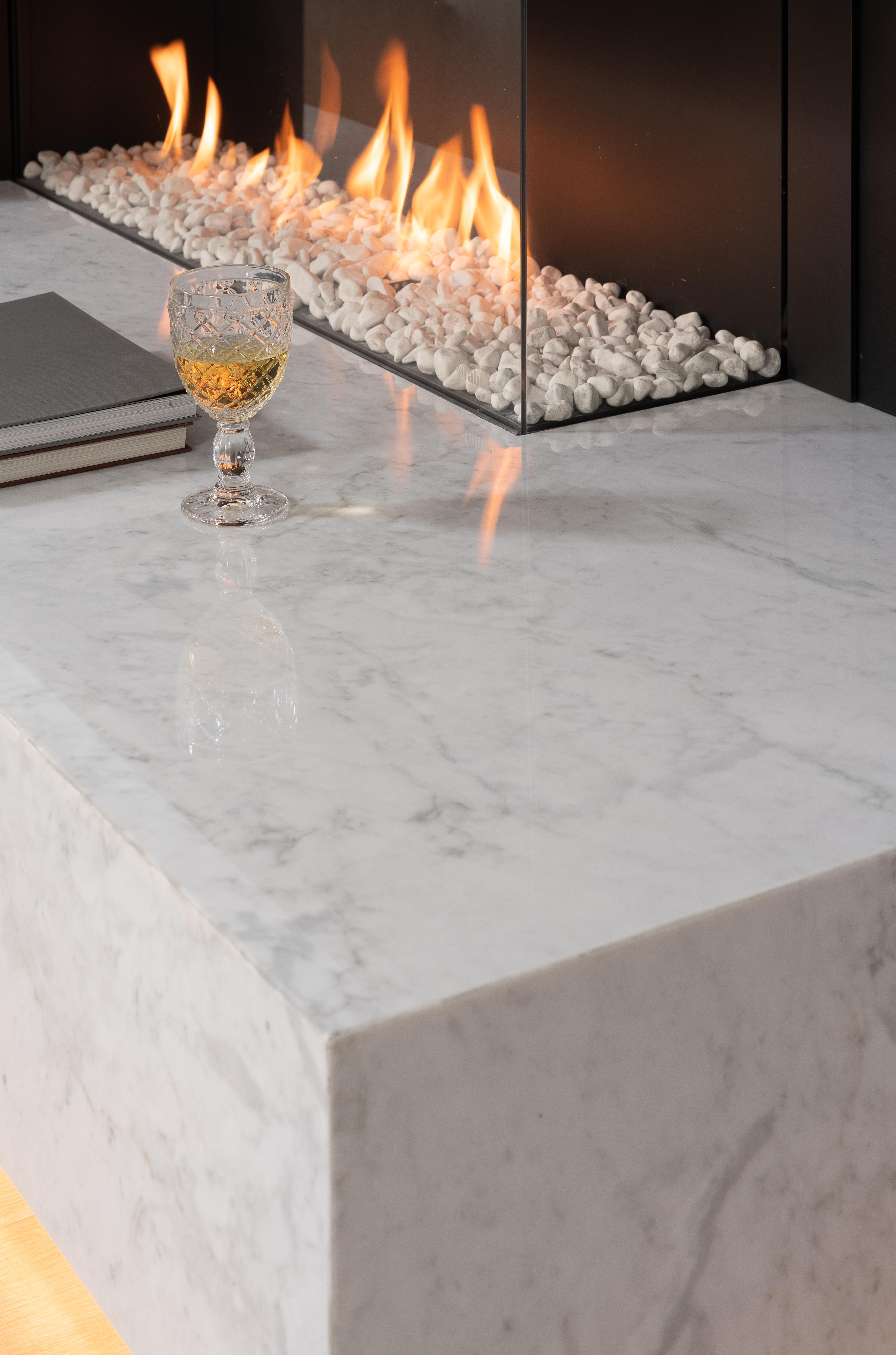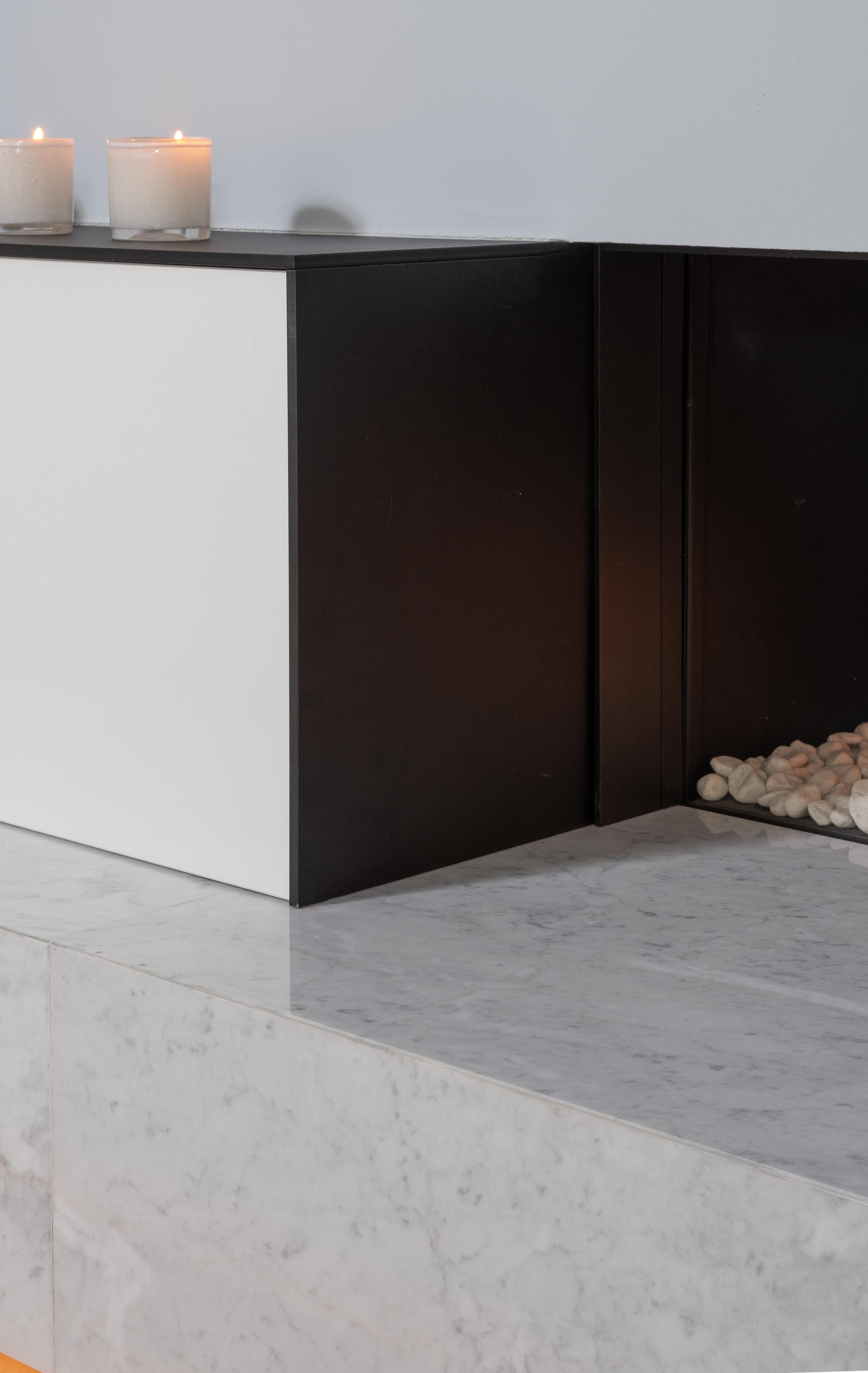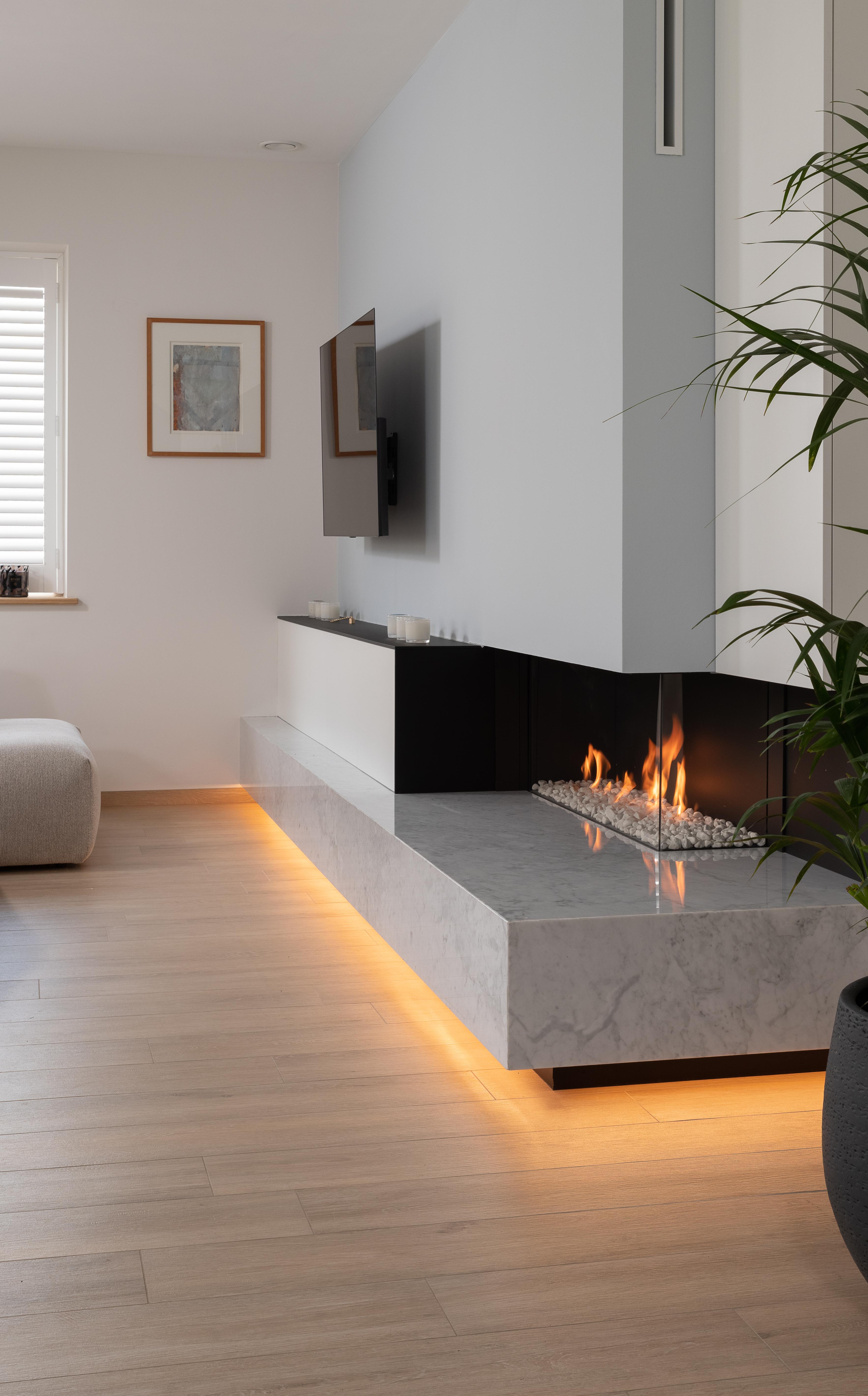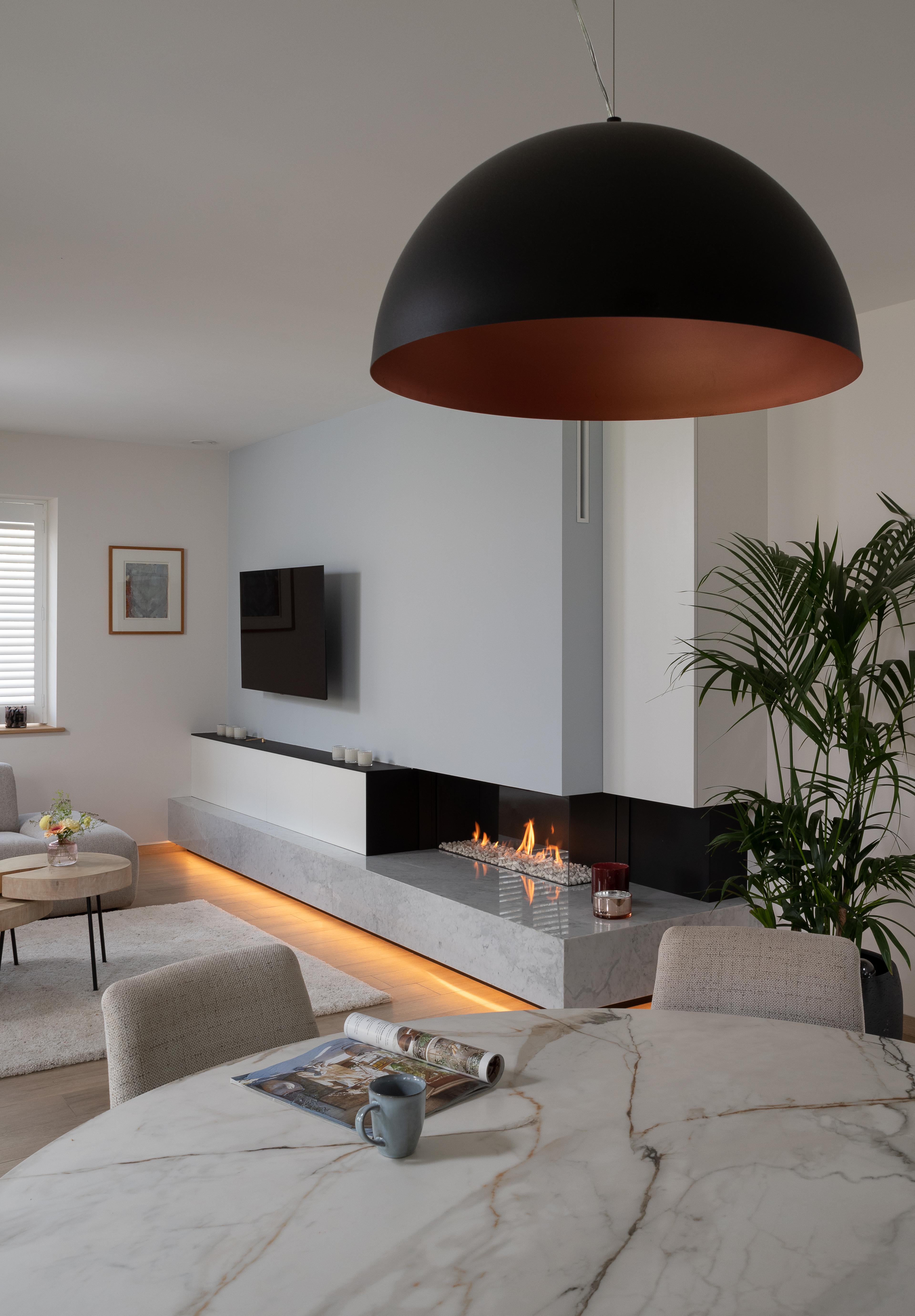 Bij deze klant werd gewerkt met echte carrara marmer om een uitstraling van ware luxe te bekomen. We werkte met een hoekhaard op gas om ook vanuit de eetplaats volledig zicht te hebben op de haard. Voor het ophangen van de TV werd een valse wand voorzien zodat de kabels niet zichtbaar naar de kast kunnen verlopen. De kast werd voorzien in wit met een stalen bekleding.