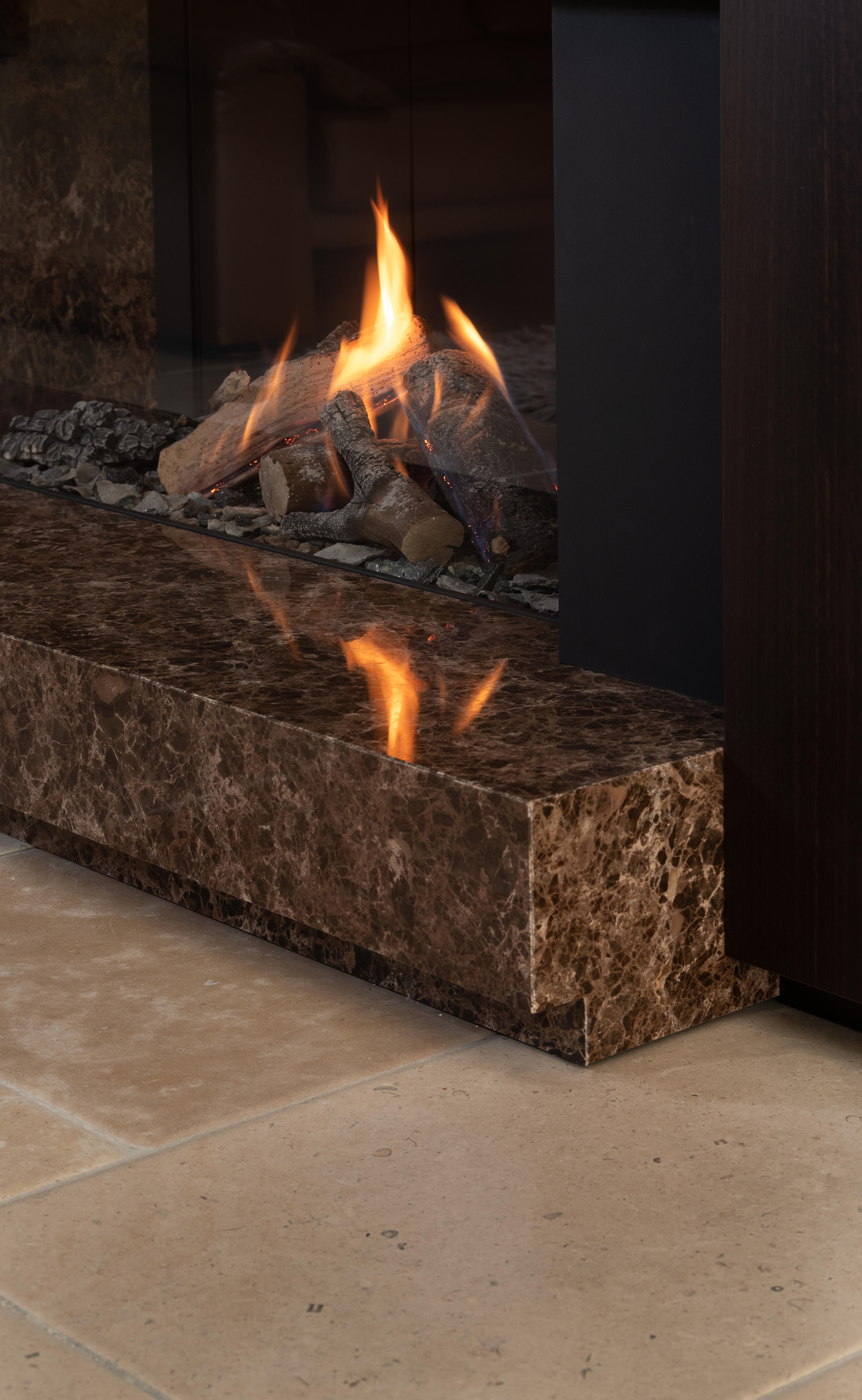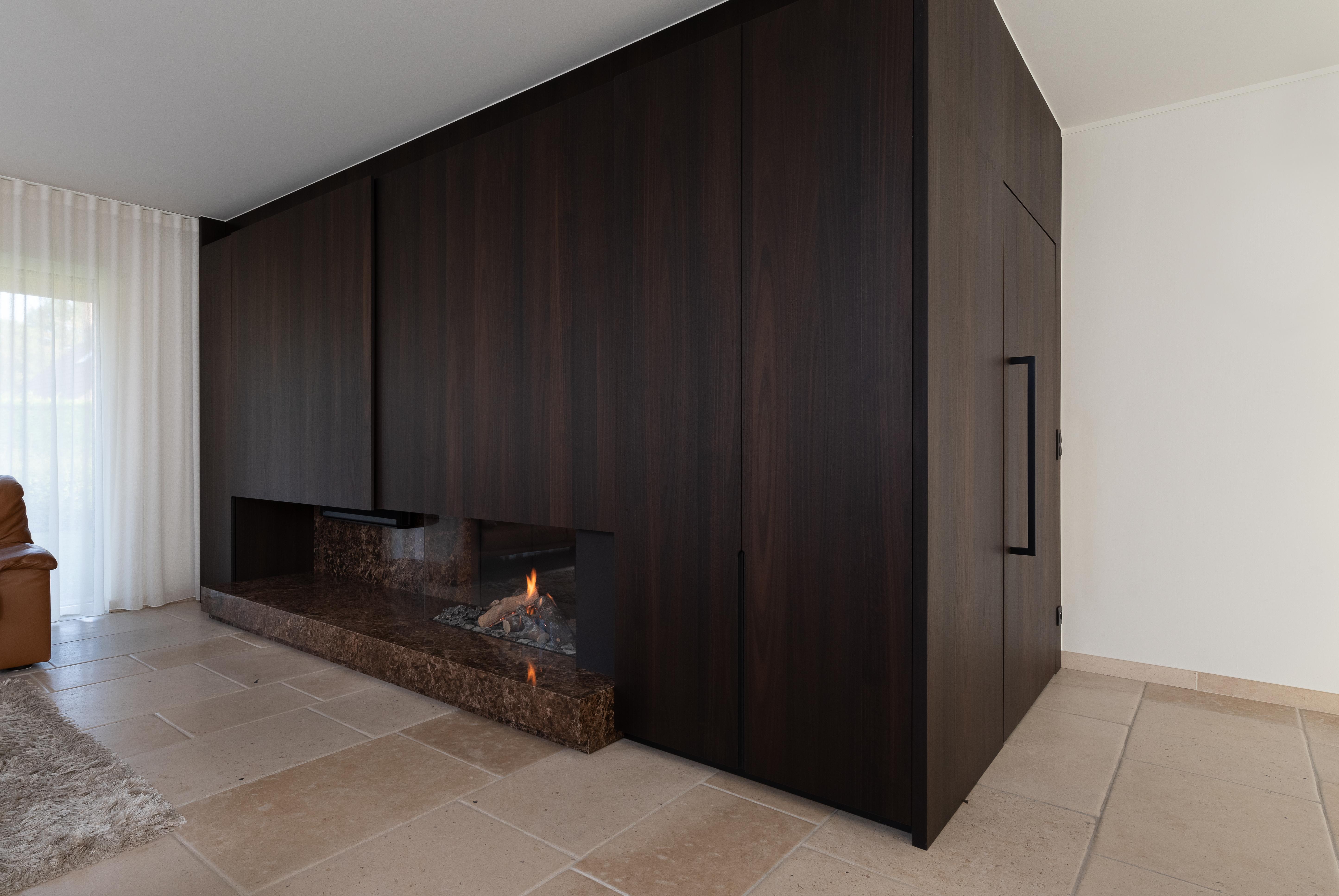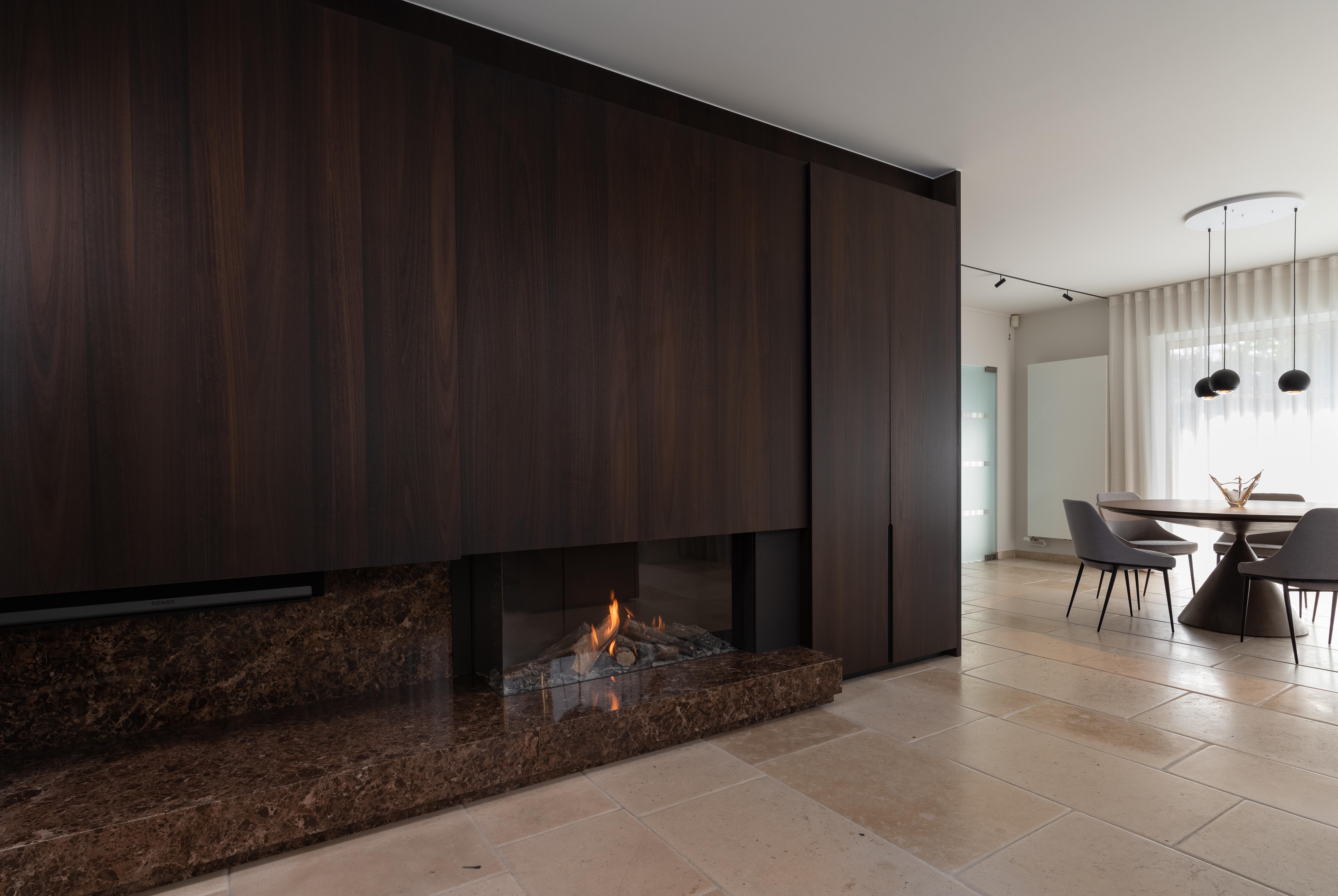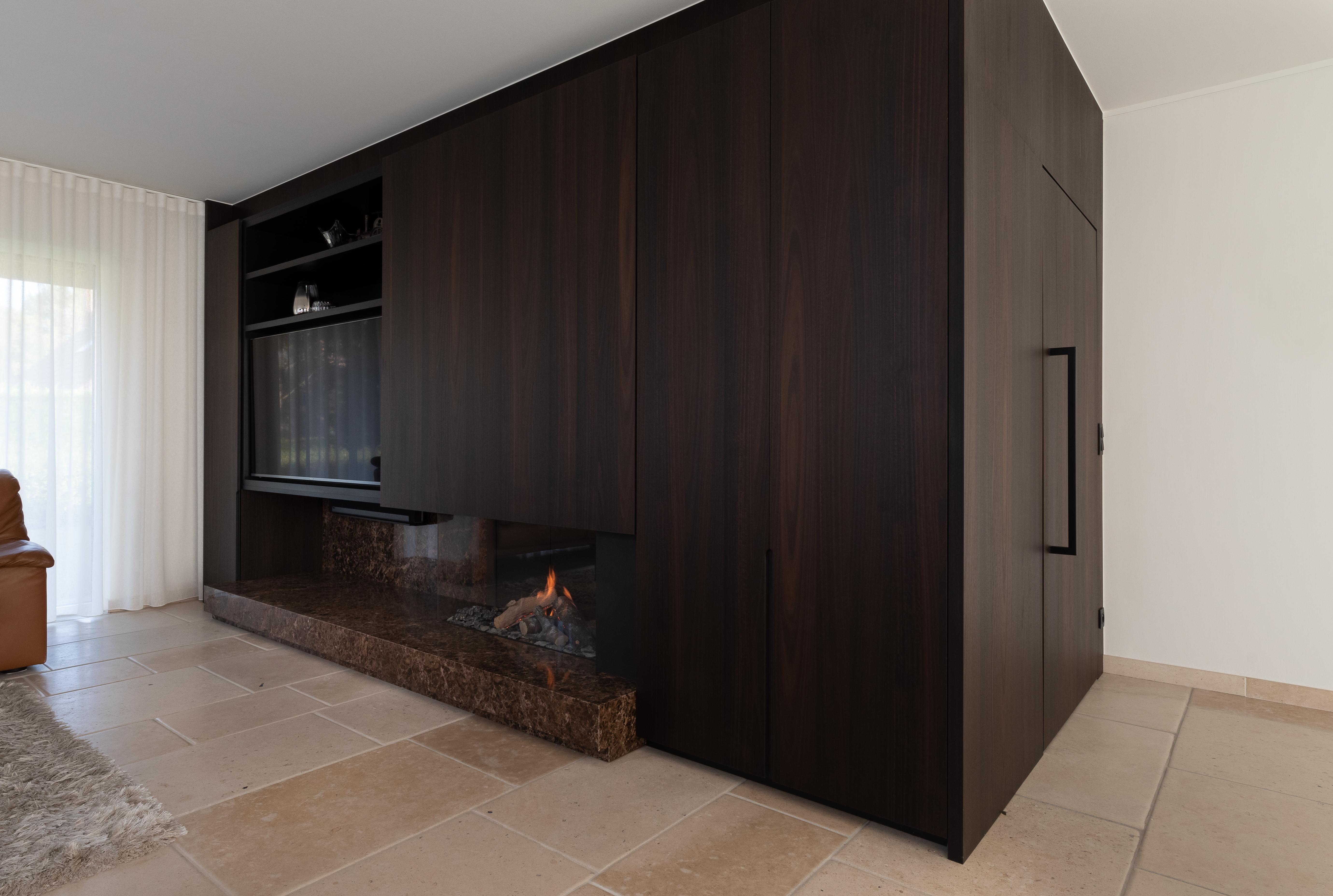 We zien hier een hoekhaard van Kalfire, ingewerkt in een haardconcept in donker houtfineer. De kast heeft een schuifdeur voor het verbergen van de tv,