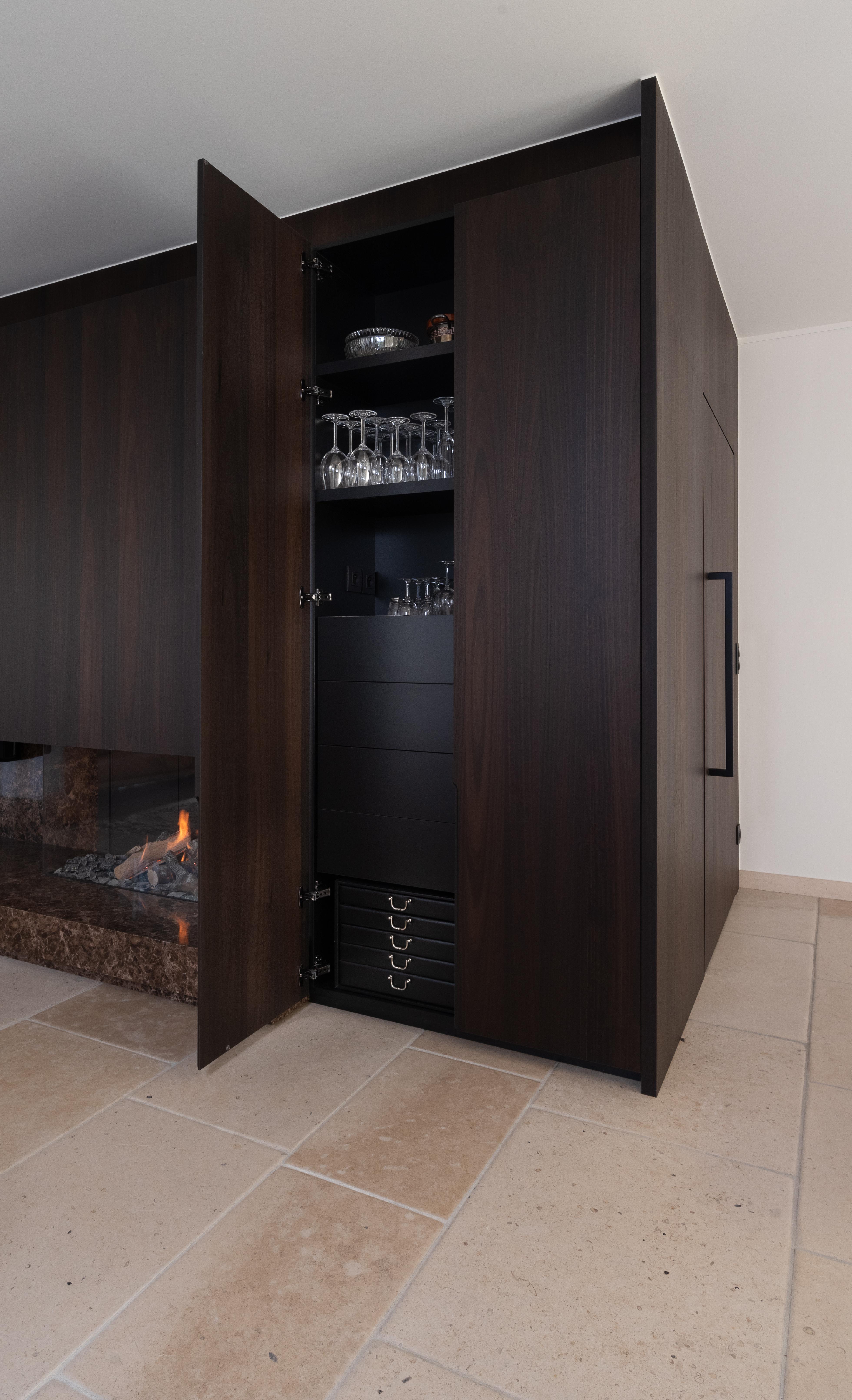 de ladekasten zorgen voor extra opbergruimte. De sokkel werd voorzien in bruine marmer. Aansluitend werd in de hal een witte kast in MDF ingebouwd.