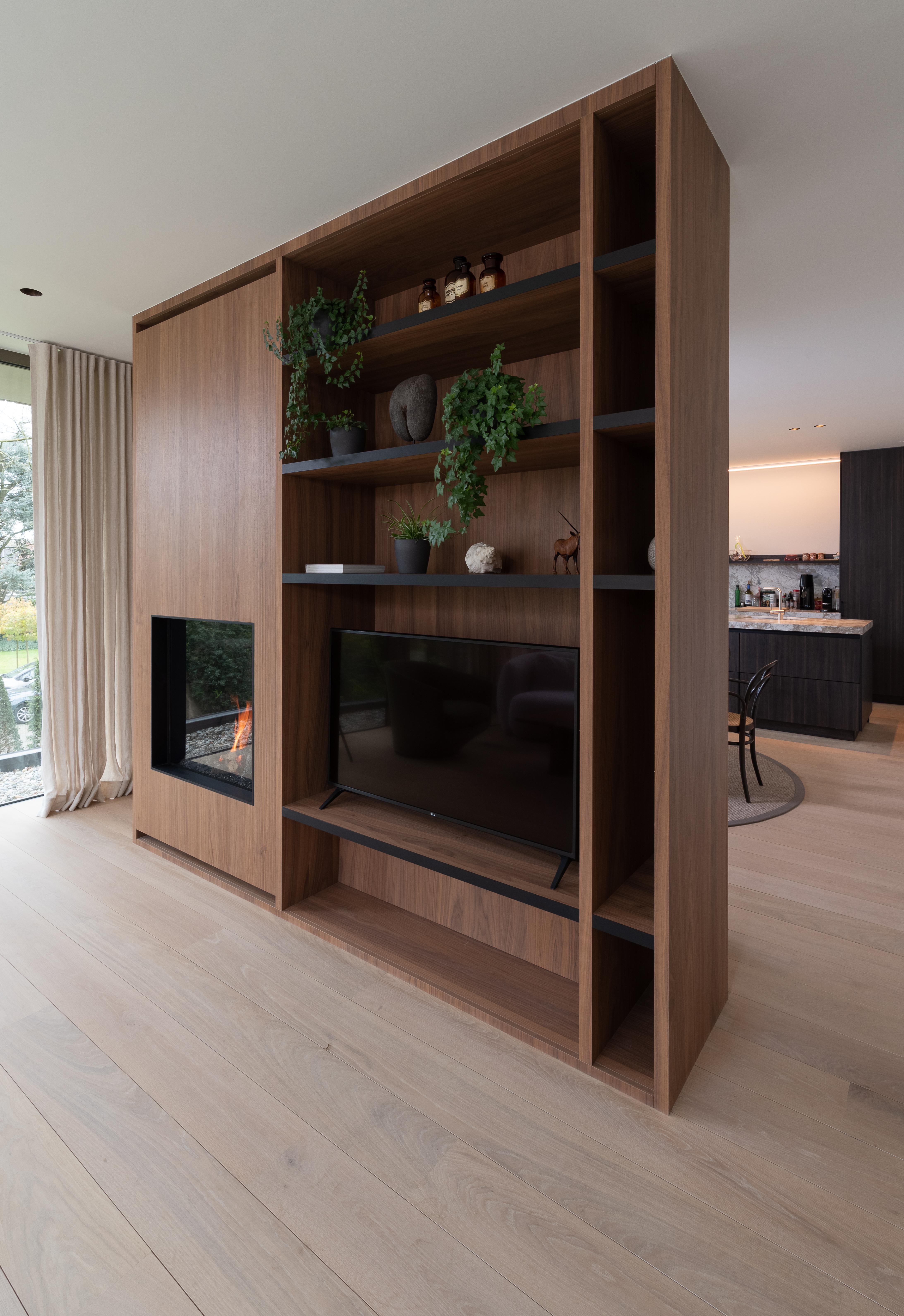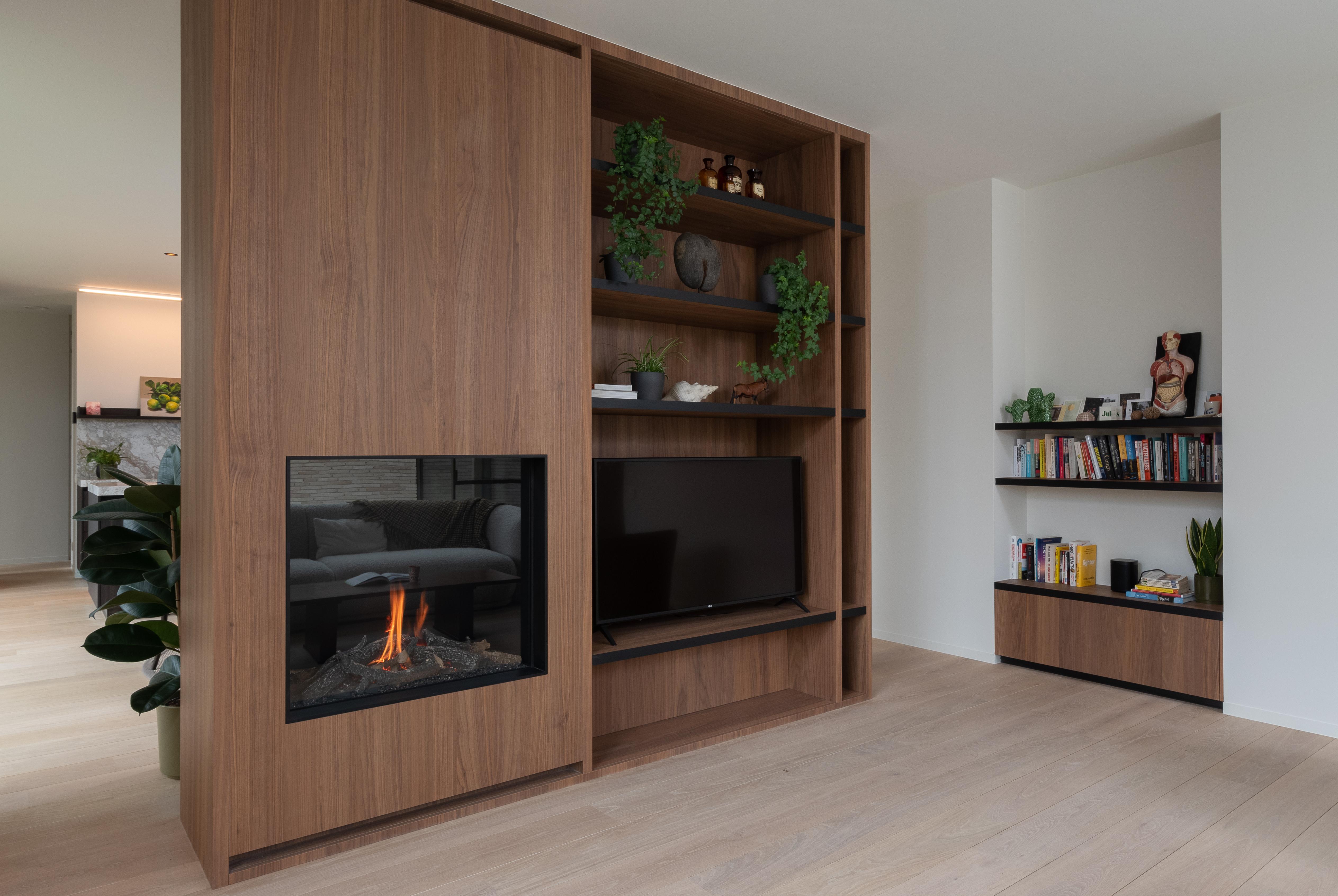 Deze wand werd volledig voorzien in notelaar hout, zo kreeg het geheel een warme uitstraling. Door een vierkante gashaard met houtdecoratie te plaatsen krijgt de ruimte een mooie invulling. De legplanken werden met zwart afgeplakt om een speelsheid te creëren.