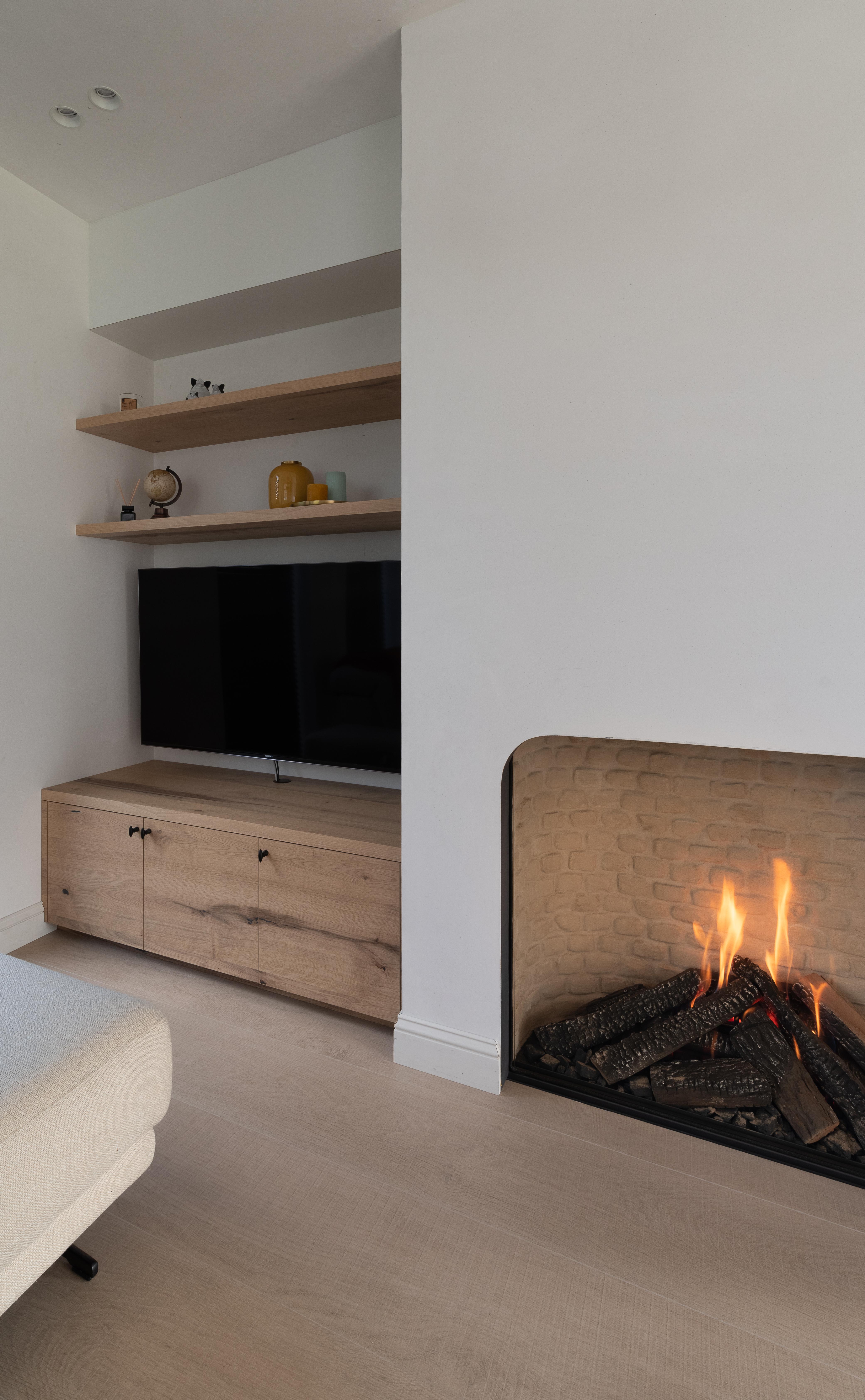 We zien hier een afgeronde gashaard van Cosyflame, met een gekaleid interieur. De haard werd ingebouwd op vloerniveau om het gevoel van een echte openhaard te evenaren. De TV kast met bijhorende legplanken weren voorzien in hout fineer, op de kast werden zwarte handgrepen geplaatst.