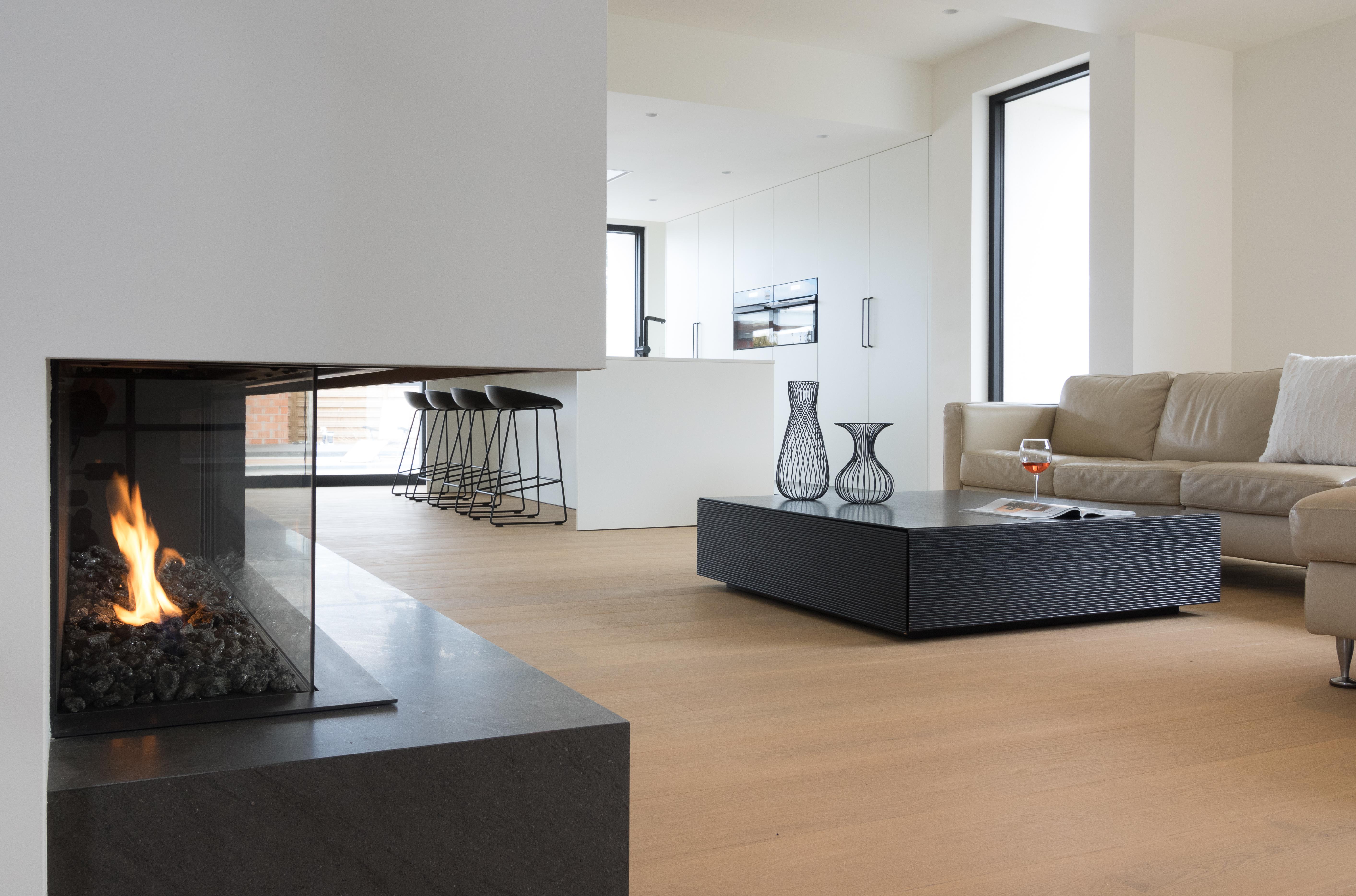 Door deze hoekhaard van Kalfire dicht bij de deur te plaatsen heb je direct bij binnenkomst een mooi zicht op de vlammen.