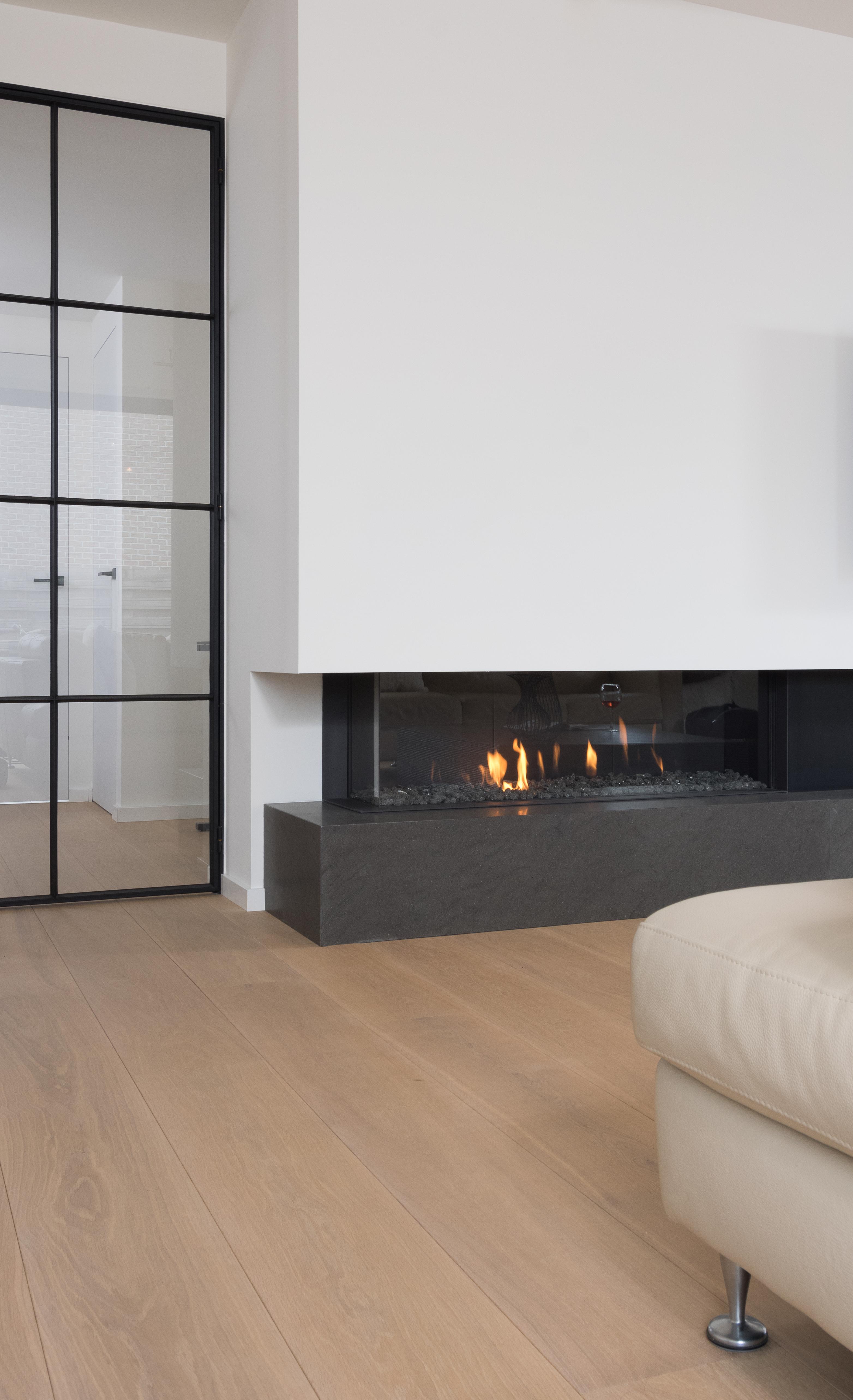 De haardwand werd samen met de muren van de woning gepleisterd om zo een mooi geheel te verkrijgen.