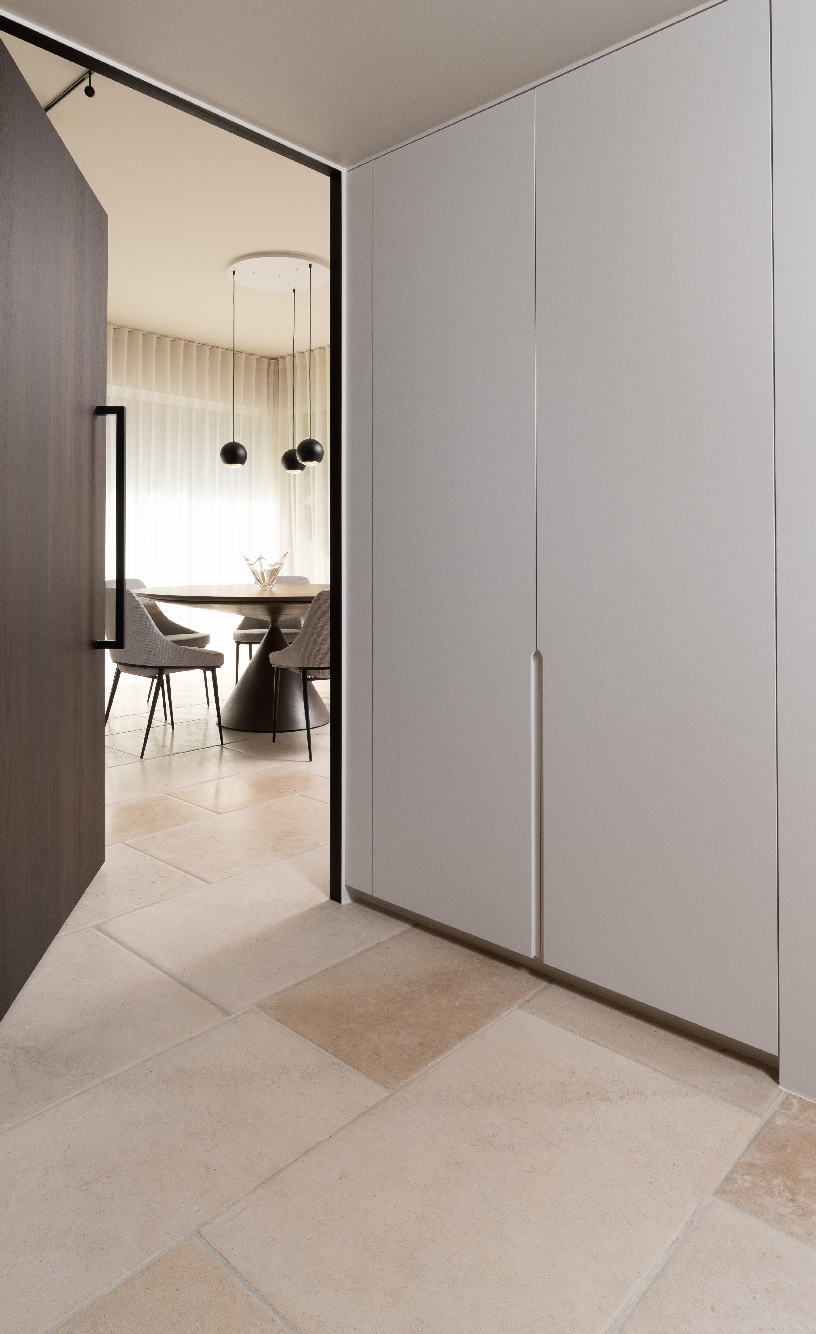 de ladekasten zorgen voor extra opbergruimte. De sokkel werd voorzien in bruine marmer. Aansluitend werd in de hal een witte kast in MDF ingebouwd.